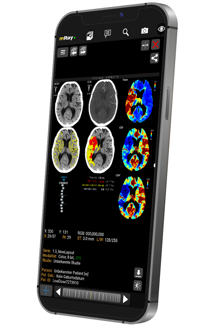 Durch die vollständige Integration in mRay werden allen Beteiligten in Echtzeit informiert und können sich, natürlich auch über mobile Endgeräte, zu dem Fall ortsunabhängig abstimmen. Therapieentscheidung erfolgen schnell und dennoch evidenzbasiert entsprechend der European Stroke Organisation (ESO).