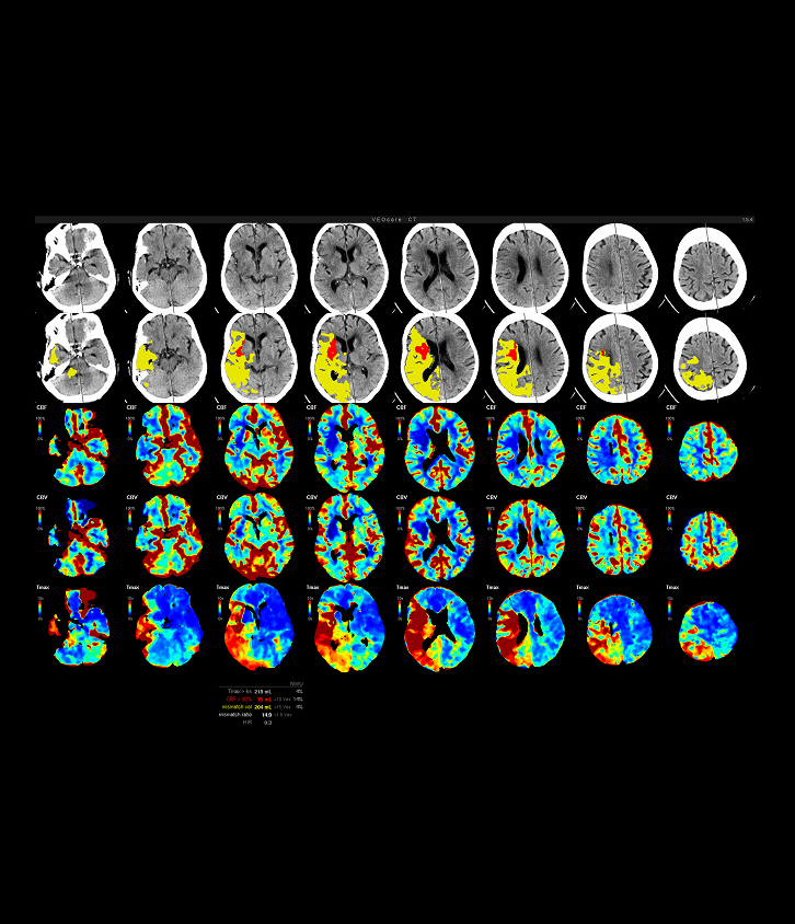 Die Perfusionsanalyse von Aufnahmen des Gehirns ermöglicht die Darstellung und Quantifizierung von minderdurchblutetem Gewebe (Penumbra), nicht-durchblutetem Gewebe (Kerngewebe) und dem Mismatch-Ratio zwischen den beiden Werten. Die berechneten Werte können der Unterstützung bei einer Entscheidungsfindung dienen, die auf der Beurteilung des Ausmaßes der Schädigung von Geweben basiert.